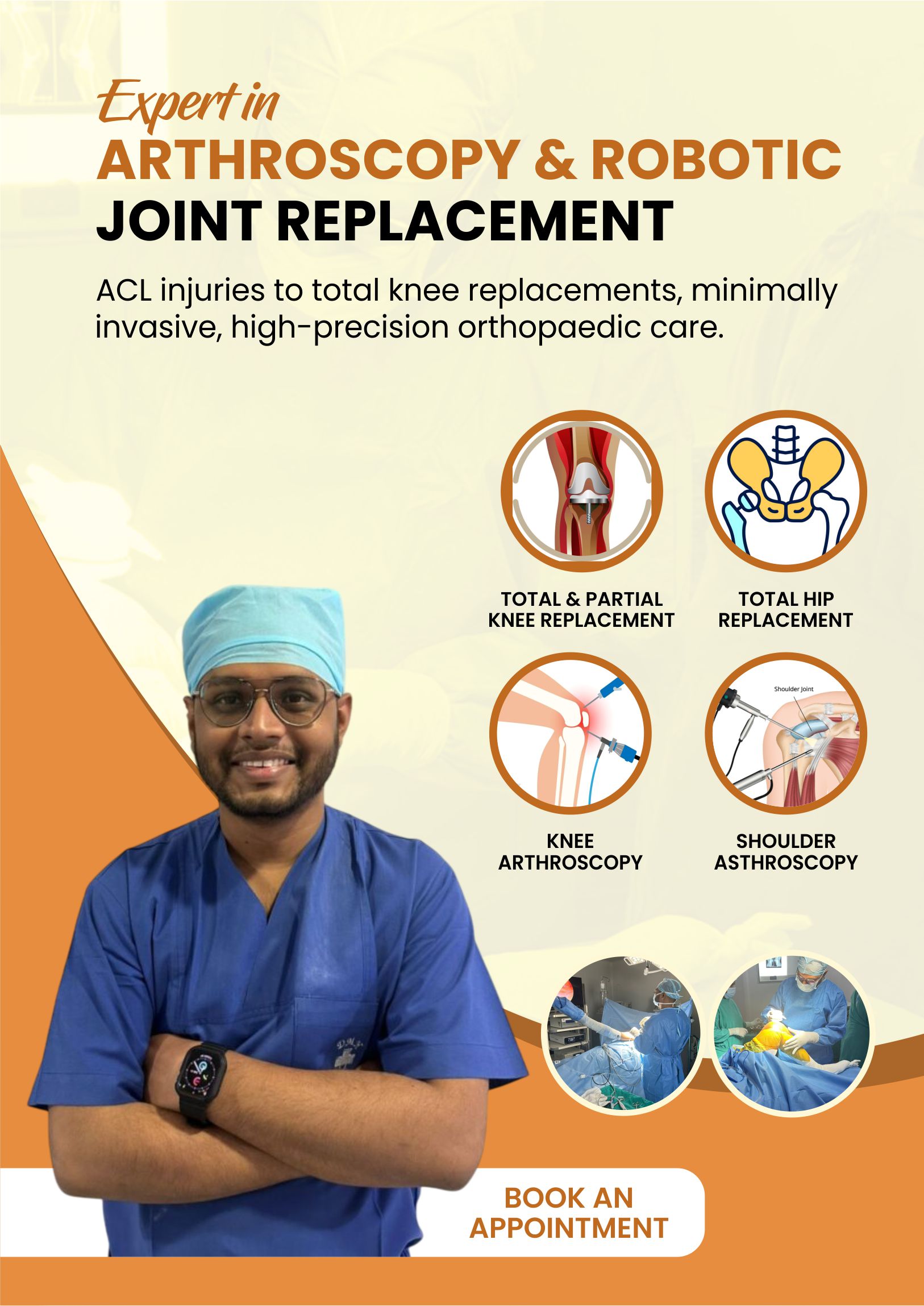 I have undergone advanced fellowship training in Robotic and Conventional Arthroplasty at Sunshine Bone & Joint Institute, Hyderabad, and in Arthroscopy & Sports Medicine (ISAKOS-accredited) at Manipal Hospital, Bangalore. I also hold the FIFA Diploma in Football Medicine, further enhancing my expertise in managing sports-related orthopaedic conditions.